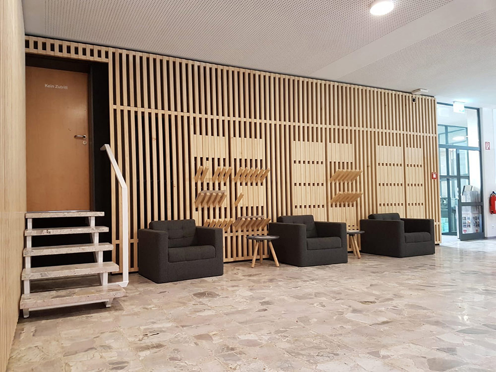 Für das Kurhaus Hinterzarten entwarfen andOffice ein helles und reduziertes Farb- und Materialkonzept, welches sich perfekt in die 60er-Jahre-Architektur fügt. Die Lammellenstruktur aus Tannenholz sorgt für ein freundliches und offenes Ambiente, welches sich im Foyerbereich, im Café, in den Konferenzräumen sowie im Wartebereich mit Garderobe wiederfindet.