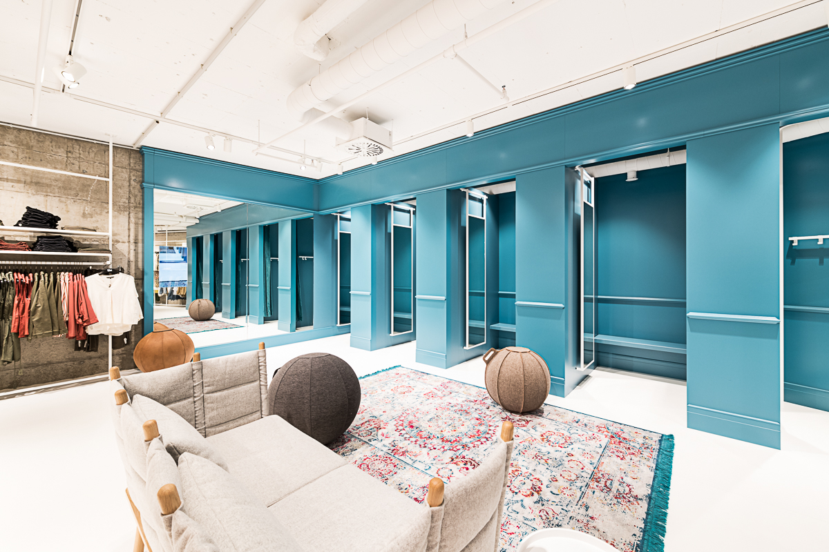 Innerhalb sechs Wochen entstand eine harmonische Atmosphäre, die durch warme Naturtöne und cleane Grautöne den jungen Fashion-Zeitgeist mit historischem Ambiente kombiniert. Neben den alten, wieder freigelegten Backsteinwänden dominieren Sichtbeton, Stahl, Holz und Filz die Gestaltung. Mit vielen Sofas und Sesseln sowie einer breiten Holztreppe bietet der Store eine große Anzahl an gemütlichen Sitzgelegenheiten, die genügend Platz und Zeit zum Anprobieren bieten und den Besuch im TC Buckenmaier zu einem einmaligen Shoppingerlebnis machen.