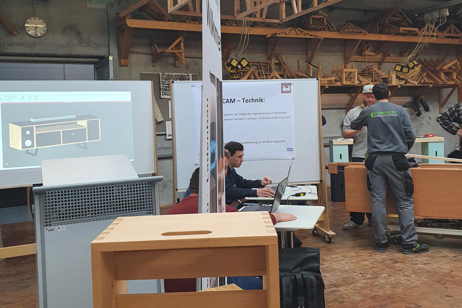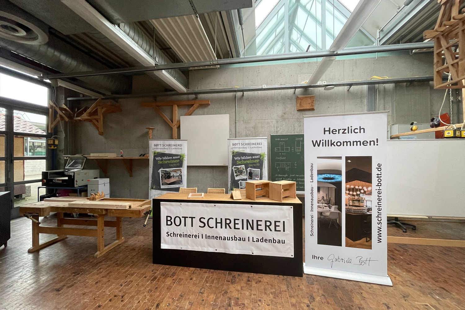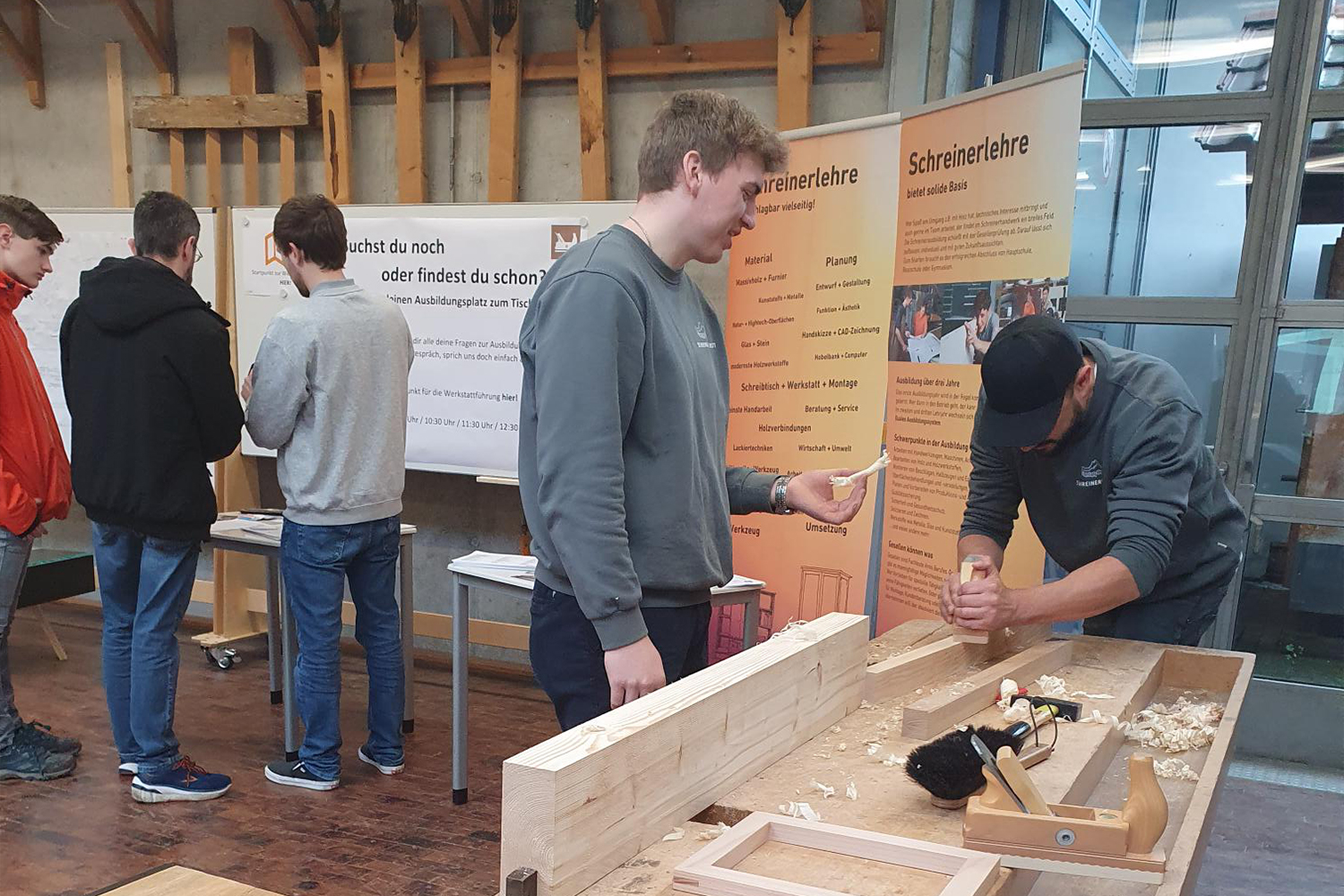 Wir nahmen ebenfalls an diesem Event teil, mit dem Ziel, junge Menschen für unseren Beruf zu begeistern. Unterstützt von unseren drei Auszubildenden, präsentierten wir den Beruf des Schreiners und boten den Jugendlichen die Möglichkeit, selbst Hand anzulegen und das Hobeln an einer Holzdiele auszuprobieren.
