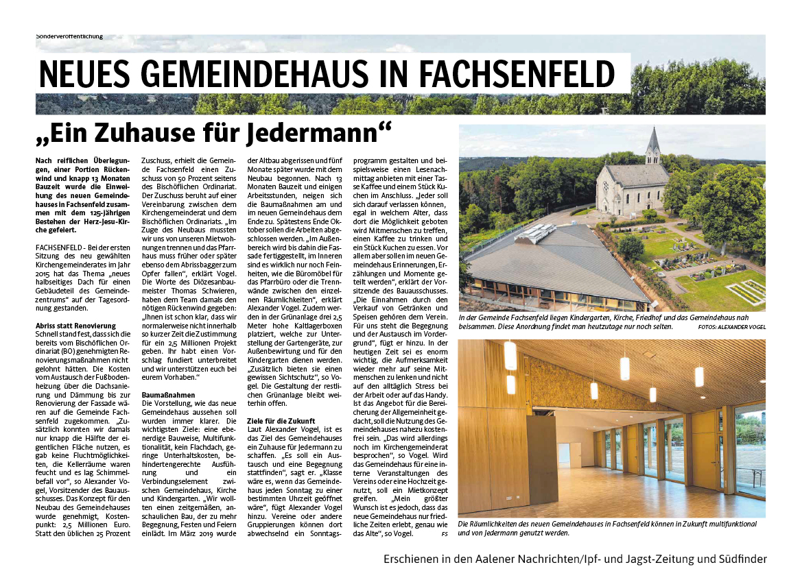 Am 30. September 2020 erschien in den Aalener Nachrichten/Ipf- und Jagst-Zeitung und Südfinder ein Artikel über das neue Gemeindehaus in Fachsenfeld.